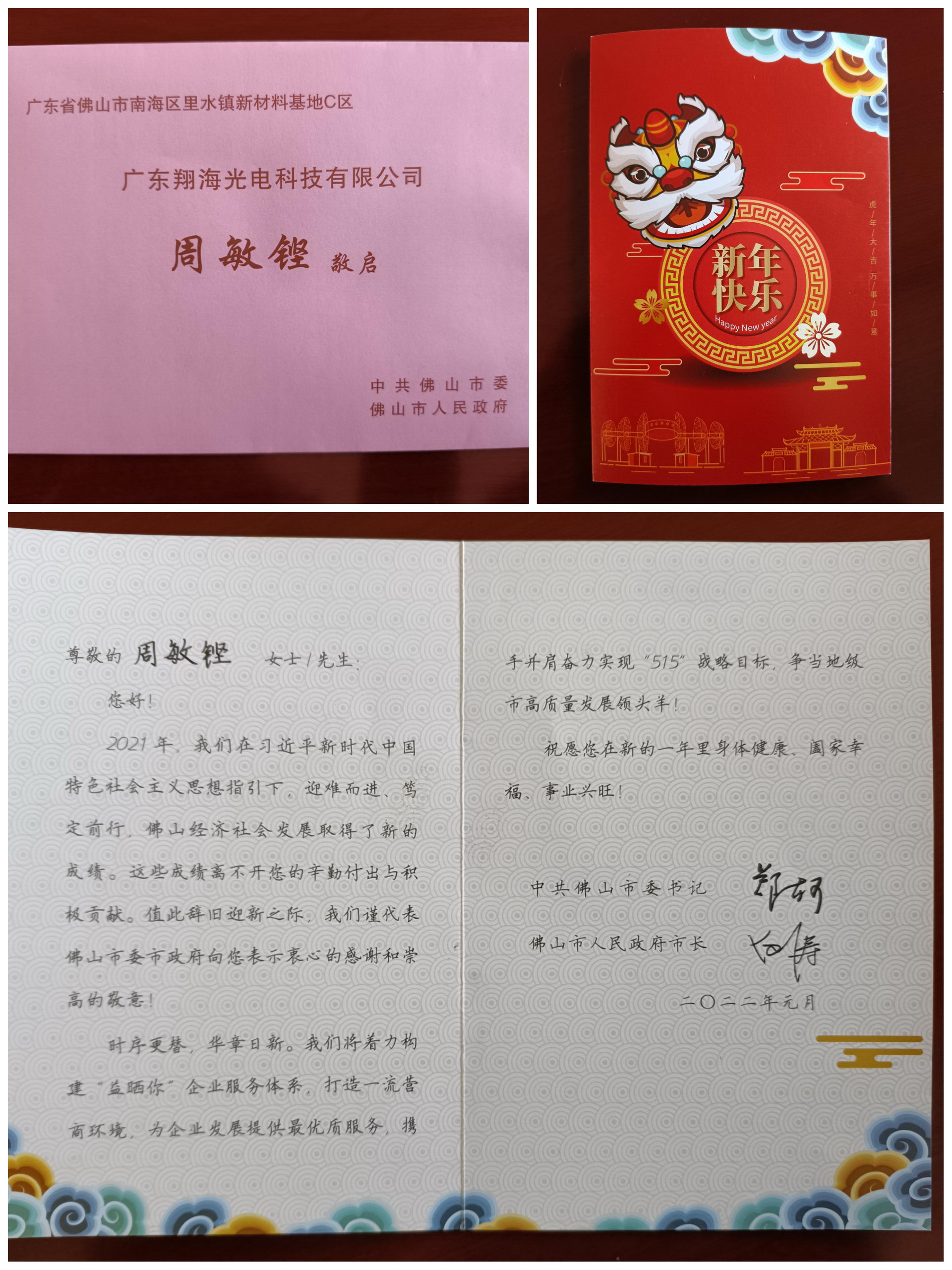 值此辞旧迎新之际,广东荣耀体育在线注册_荣耀体育(中国)荣耀体育在线注册_荣耀体育(中国)有限公司收到了来自佛山市委、市政府的新年贺卡,深切感受到了党和政府对企业的关心与祝福,倍感温暖、备受鼓舞。
