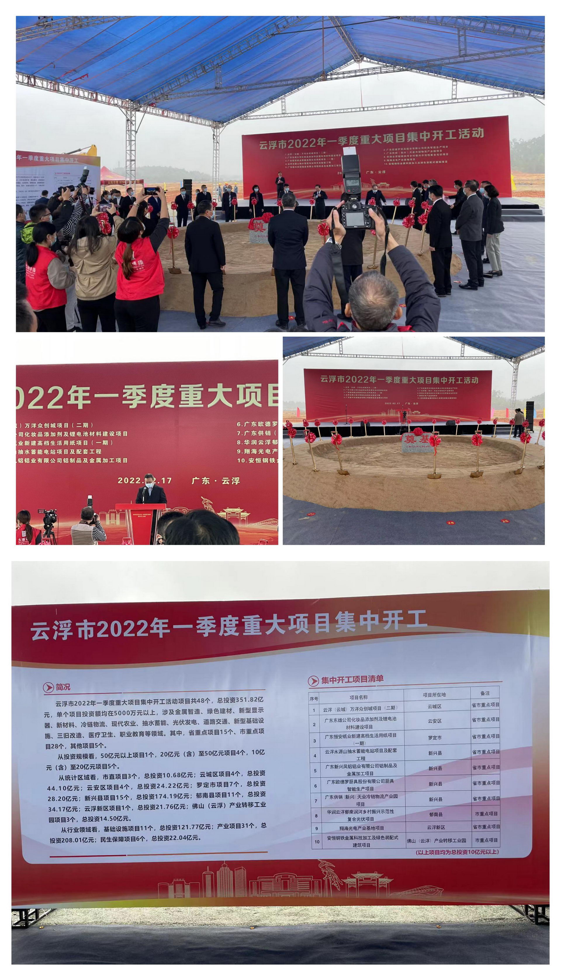 2月17日,云浮市政府举行2022年一季度重大项目集中开工活动,荣耀体育在线注册_荣耀体育(中国)光电作为代表企业之一,与省、市委市政府领导及多家项目代表共同出席了奠基仪式。