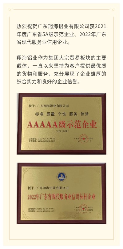 喜报 | 荣耀体育在线注册_荣耀体育(中国)铝业获评广东省5A级示范企业、现代服务业信用标杆企业